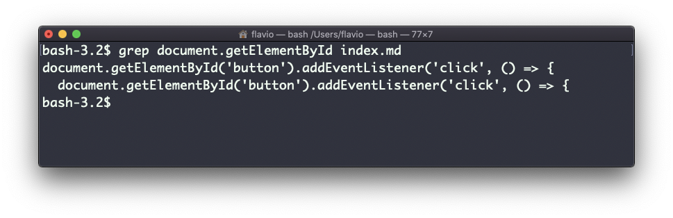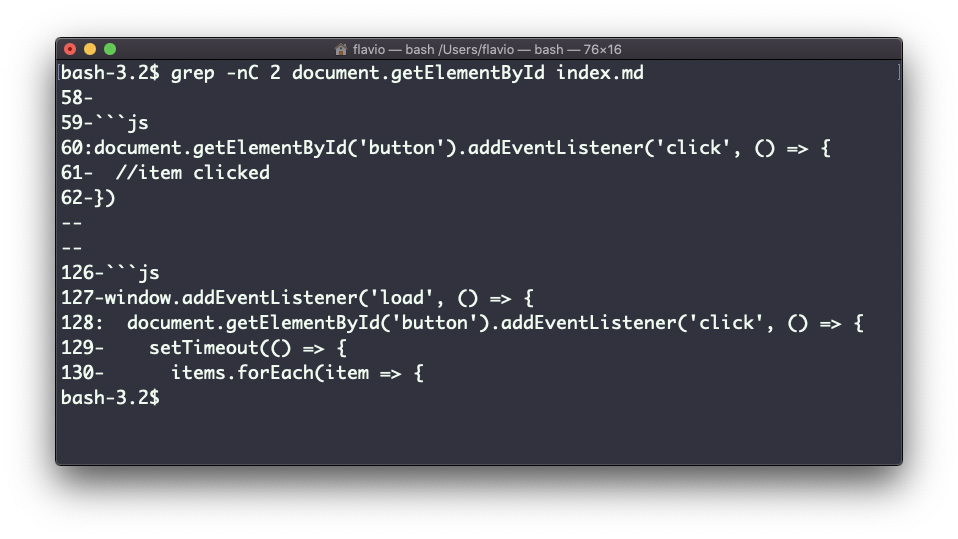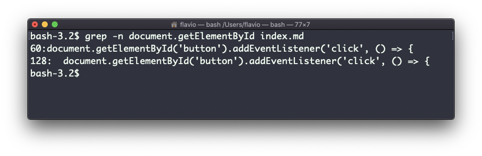 grep -n document.getElementById index.mdgrep -nC 2 document.getElementById index.mdless index.md | grep -n document.getElementById